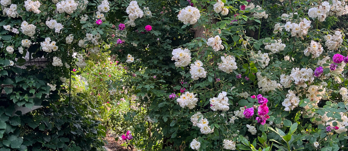 „Rund 170 Rosensorten starten im Juni mit ihrem Blütenfest. Dazu zählen 50 Rambler und Kletterrosen, die am Wohnhaus, in Bäumen, an Rosenbögen, Pergolen und Obelisken heimisch sind. Eine Dokumentation der Rosen liegt vor. In der Regel mixen sich Rosen mit Gräsern und Stauden, wozu auch zahlreiche Päonien gehören.